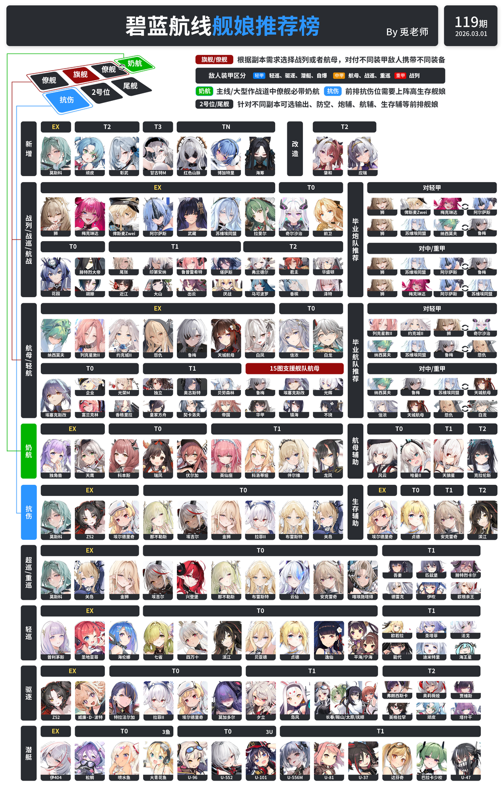 ※兎老師のチャンネル(?)から"TA的视频"の所で動画版、”TA的专栏”の記事から画像版を見る事ができ、高解像度の画像をダウンロードできるURLも掲載されている(※保存場所が変わり百度のIDが必要)。ちなみに該当する動画や記事は、"碧蓝航线舰娘强度榜第〇〇期-(略)"のようなタイトルで、〇〇の数字が大きなものが新しい(と思う)ちなみに上記画像は114期。