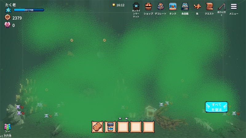 本作品はドット絵なので、『AQUAZONE』のようなリアルさはありません。しかし、釣りができる要素や、オンラインでフレンドの水槽を訪問できるなど、新作ならではのコンテンツが豊富です。価格も手頃で、初期の説明がやや分かりにくい点を除けば、非常に完成度の高い作品だと感じました。